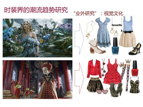 在時(shí)裝行業(yè),與社會(huì)文化進(jìn)化的關(guān)聯(lián)超過其他各種行業(yè),是解譯潮流趨勢的第一種工具。 這些工具將從以前主要通過設(shè)計(jì)師的預(yù)見能力來實(shí)現(xiàn)的、未經(jīng)組織和無程式的應(yīng)用切換為有一系列精到技術(shù)的、有章法的應(yīng)用,它在時(shí)裝行業(yè)已經(jīng)形成專業(yè)的運(yùn)行體系。圖1為依據(jù)電影《愛麗絲夢游仙境》的場景所提取的潮流元素如色彩、形態(tài)等,汲取靈感而設(shè)計(jì)的服裝。