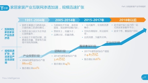 伴隨著互聯(lián)網(wǎng)在家居家裝產(chǎn)業(yè)的加速滲透,從1991年至2016年的26年里,建筑裝飾工程總產(chǎn)值達(dá)到了4.87萬(wàn)億元,整個(gè)家居家裝產(chǎn)業(yè)從最初的產(chǎn)業(yè)探索階段,經(jīng)歷了團(tuán)購(gòu)階段、整裝套餐階段后,平臺(tái)化開(kāi)始興起。