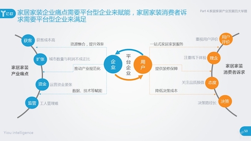 億歐智庫(kù)認(rèn)為,當(dāng)下家居家裝企業(yè)的痛點(diǎn)和消費(fèi)者訴求,需要大的平臺(tái)型企業(yè)來(lái)賦能家居家裝企業(yè)和滿足消費(fèi)者訴求。大平臺(tái)可以通過(guò)自己擅長(zhǎng)的數(shù)據(jù)、技術(shù)等優(yōu)勢(shì)賦能中小企業(yè),讓中小企業(yè)專注自己擅長(zhǎng)的事情,通過(guò)資源整合,優(yōu)化家居家裝流程,提升效率,推動(dòng)家居家裝產(chǎn)業(yè)規(guī)范化。同時(shí),家居家裝平臺(tái)型企業(yè)可以協(xié)同中小企業(yè)共同服務(wù)消費(fèi)者,為消費(fèi)者提供一站式家居家裝產(chǎn)品與服務(wù)與裝修保障,解決信息不對(duì)稱,降低決策成本。