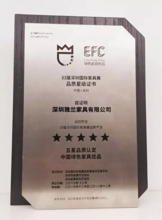不僅在企業(yè)建立嚴(yán)格的品質(zhì)標(biāo)準(zhǔn),雅蘭更是希望能推動整個行業(yè)的品質(zhì)提升。2012年,雅蘭舉辦行業(yè)首創(chuàng)“質(zhì)檢數(shù)據(jù)全球公示”活動,這是雅蘭對自身品質(zhì)的自信,也期望通過此次活動能夠推動行業(yè)對品質(zhì)標(biāo)準(zhǔn)上的認(rèn)知和重視,2018深圳國際家具展在行業(yè)首推星級品質(zhì)認(rèn)證,雅蘭獲得最高標(biāo)準(zhǔn)“5星+中國綠色家具優(yōu)品”的認(rèn)證,施生表示,“在推動品質(zhì)這條道路上,雅蘭將于深圳家協(xié)繼續(xù)攜手,砥礪前行。”