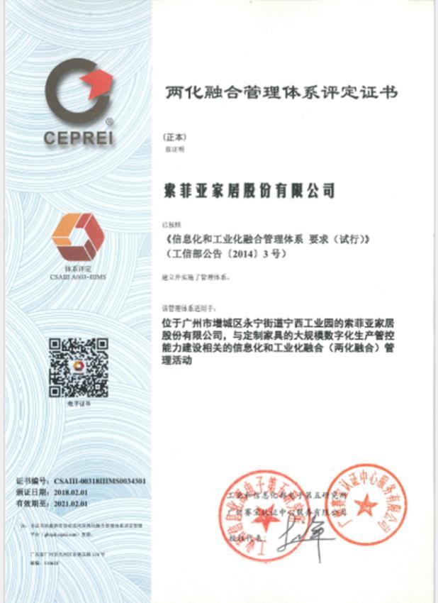 2018年2月,索菲亞家居股份有限公司成功通過了兩化融合管理體系國(guó)家工信部專家組的審查復(fù)核,獲得了由工信部電子第五研究所頒發(fā)的“兩化融合管理體系評(píng)定證書”, 成為定制家具行業(yè)中率先通過兩化融合評(píng)定的企業(yè)。
