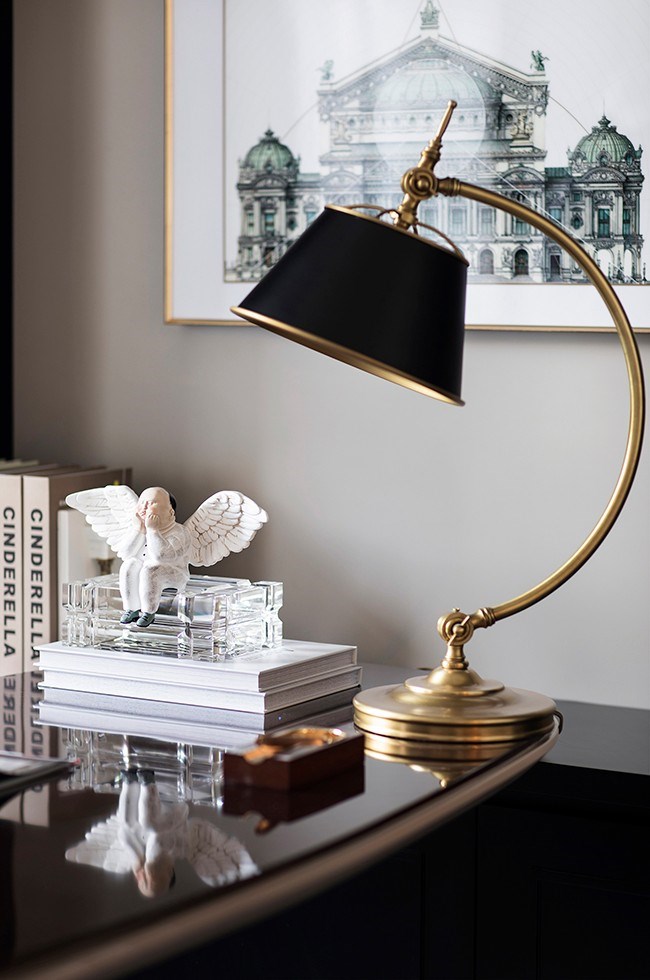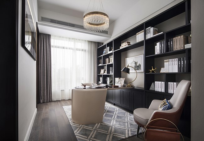 書房設(shè)計(jì)簡約高雅、舒心別致。黑漆書柜鋪滿整面墻,典雅大氣,不經(jīng)意間釋放出理性化的氣場與高貴的氣息。幾何紋路的灰色羊毛地毯,帶有一絲高貴的英倫氣質(zhì),作為過渡色讓空間韻律連貫起來。