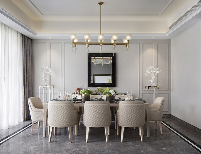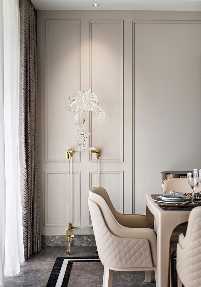 用餐區(qū)設(shè)計(jì)清雅現(xiàn)代,米白色的背景墻以簡化的護(hù)墻板包裹,左右對稱的極簡線框,正置中央的黑邊鏡框,一組水晶造型飛馬侍伴左右,共同營造出用餐的儀式美感,現(xiàn)代風(fēng)的悠然輕靈和歐式的優(yōu)雅美學(xué)于此共同發(fā)聲。