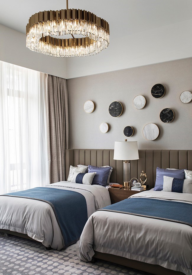 老人房為高級(jí)酒店式的雙人床大開間,設(shè)計(jì)關(guān)照老人的深度交流與更優(yōu)質(zhì)的睡眠,整體環(huán)境清爽且穩(wěn)重,圓形黑白大理石藝術(shù)裝飾畫與灰色地毯上的白色圓點(diǎn)花紋互相呼應(yīng),中性偏柔和的空間中,一抹深幽的藍(lán)色具有平衡的作用,安靜又寧謐。