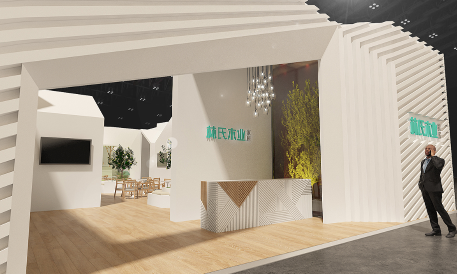 林氏木業(yè)位于10A04展館整體外觀采用白色排列的平行線條,通過不斷變化角度,制造出凹凸結構,空間感和設計感十足。(設計圖)