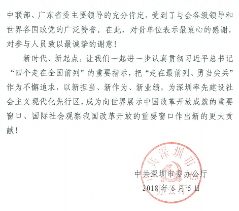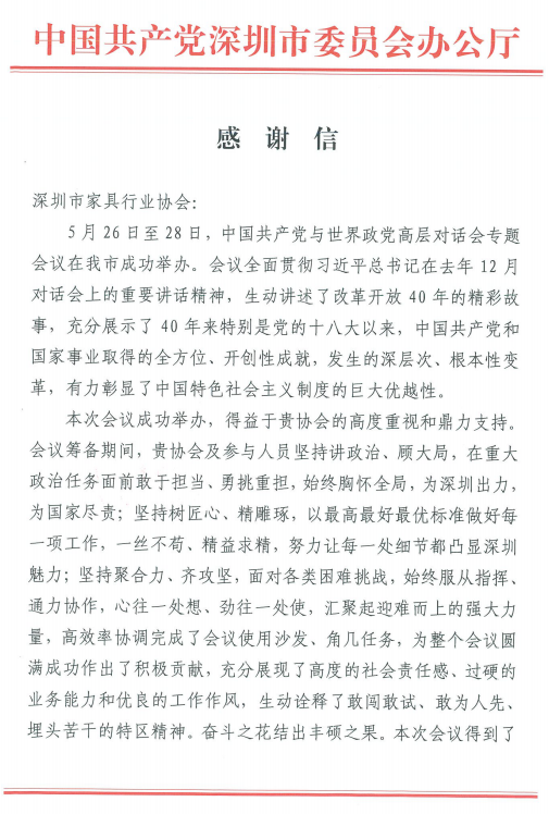由中共中央對外聯(lián)絡部主辦的中國共產黨與世界政黨高層對話會專題會議于5月26號至28號在深圳成功舉辦,中共深圳市委辦公廳向深圳市家具行業(yè)協(xié)會發(fā)來感謝信。