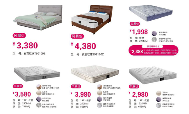 超強(qiáng)承托加強(qiáng)護(hù)脊床墊(1.8*2.0)風(fēng)暴價(jià)1998元,超靜音布袋簧床墊(1.8*2.0)2980元,高檔真皮軟床風(fēng)暴價(jià)4380元,時(shí)尚布藝軟床風(fēng)暴價(jià)3380元,除此之外,還有更多超值產(chǎn)品供您選購(gòu),具體活動(dòng)詳情可咨詢當(dāng)?shù)厮雽毚矇|專賣店。