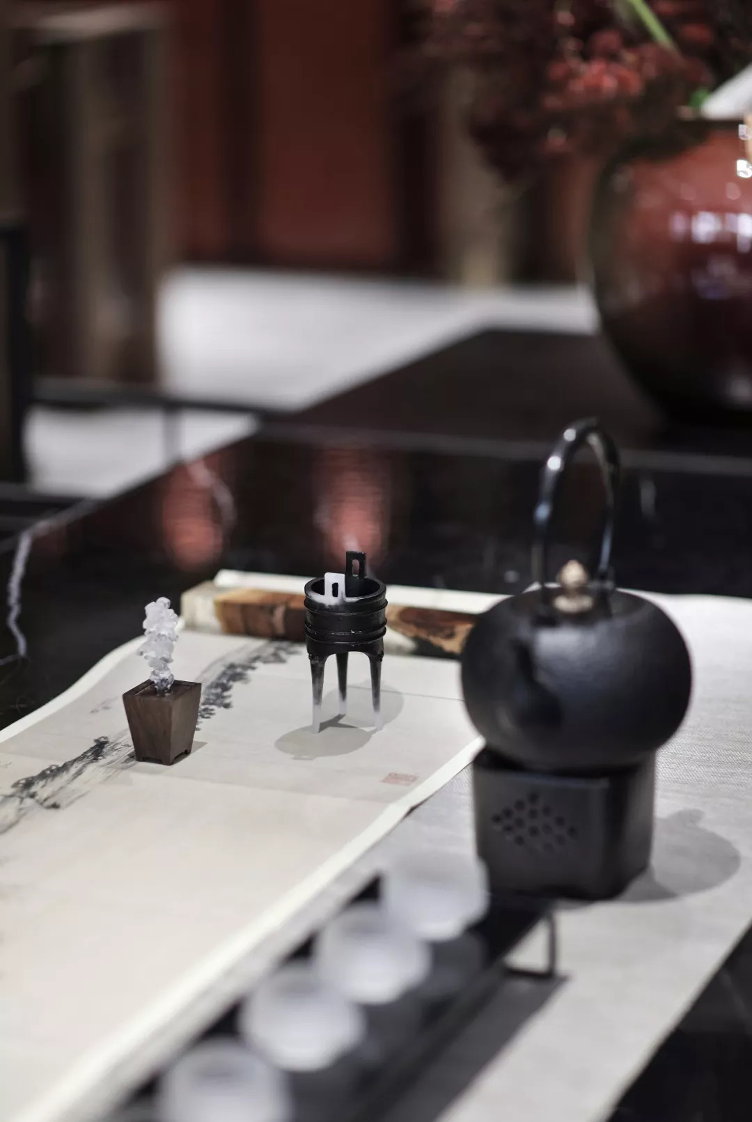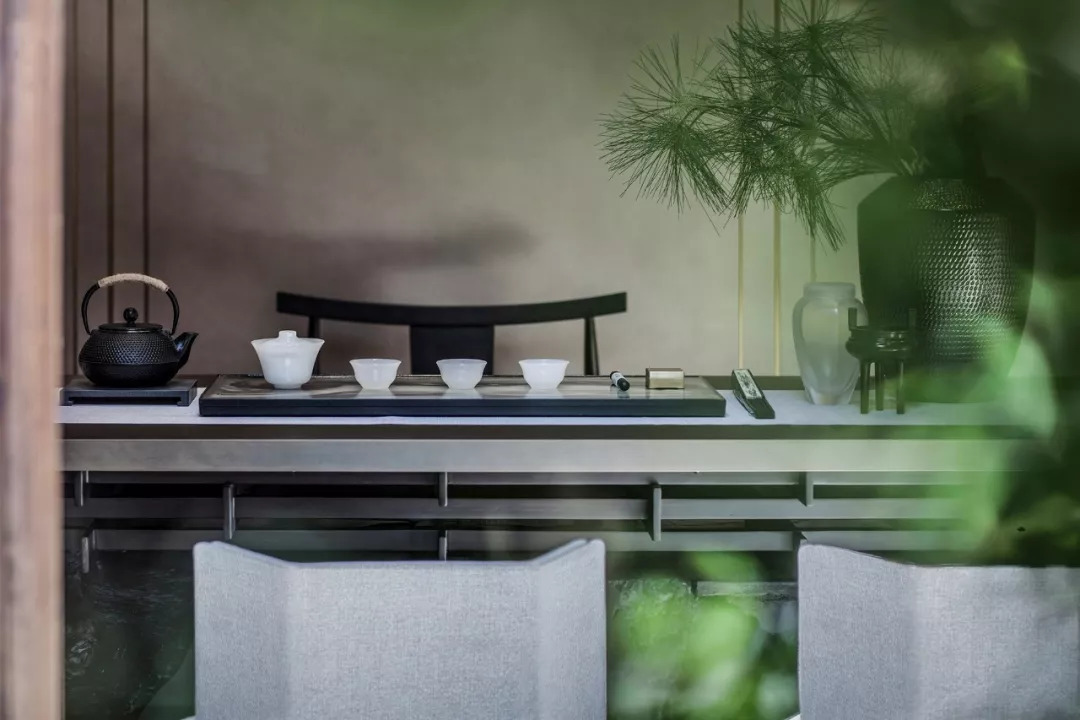 黑色的長桌對著寬敞的內院空間,在這里鋪紙碾墨,揮筆書豪,品茶會友,無不自然而愜意。