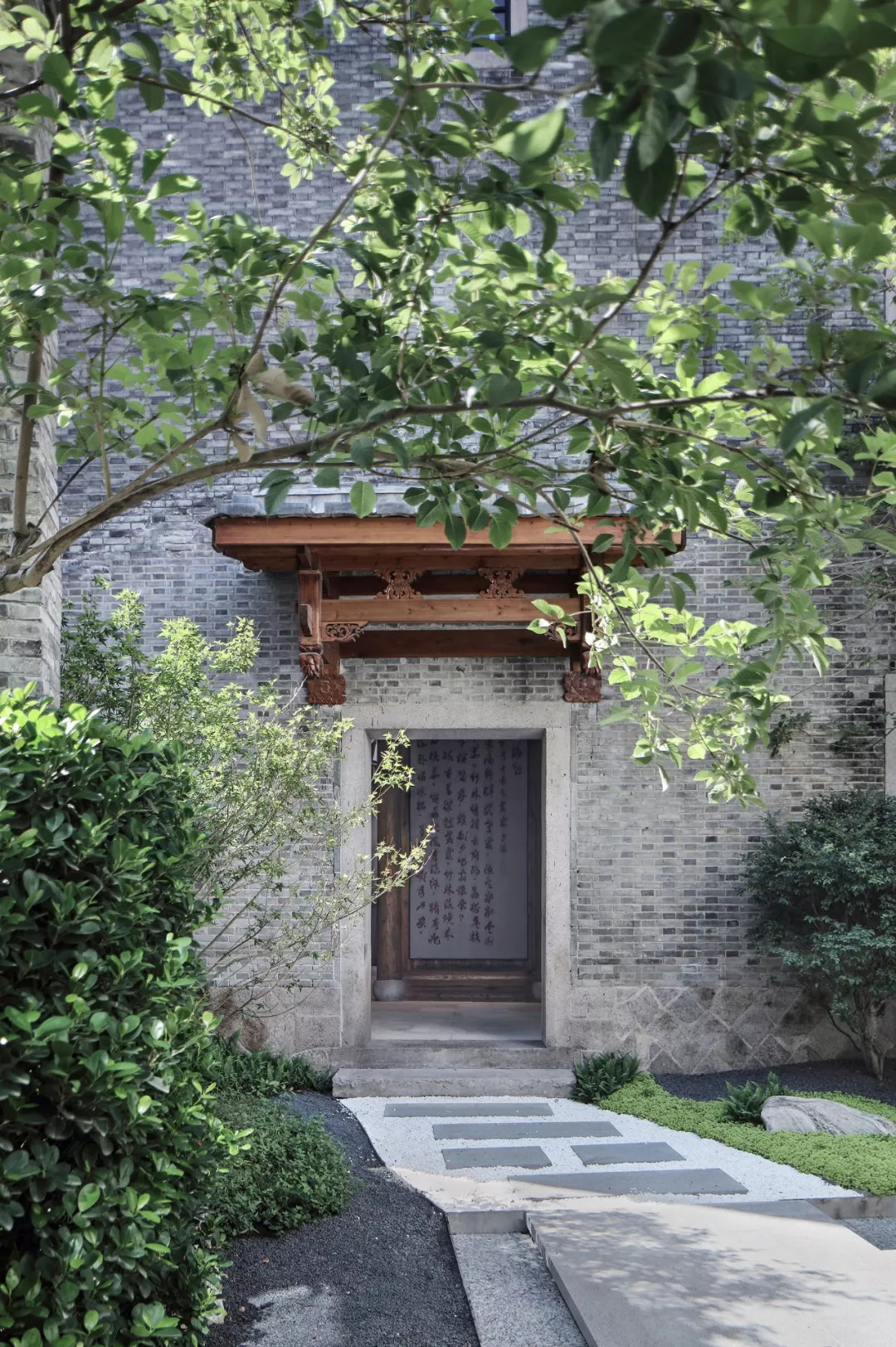 后庭院中,設計師從蒼霞民間收來的磚雕影壁“富貴書香”裝飾于墻面,并找來了清代的魚缸“滿載而歸”供石,翠松、槭楓相伴,古雅的石雕圖案掩映在蒼翠綠葉間,營造出自然雋永、寧靜悠然的庭院氛圍。