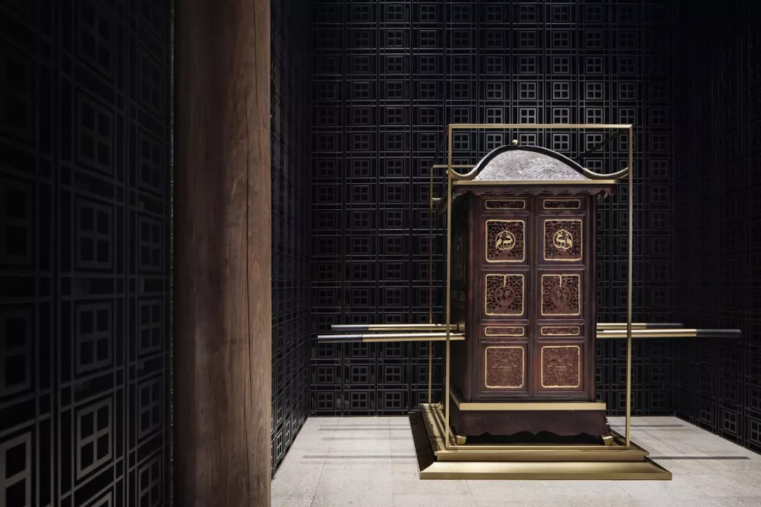 在宅院一進后堂,設計師巧妙地將清末官轎置入空間,讓傳統(tǒng)融合著當代美學,以裝置藝術的形式展現(xiàn)古今結合的裝飾主義。此轎子收于蒼霞民間,為高官所乘,設計以現(xiàn)代手法予以修正,貴雅的棗紅色結合金屬部件,讓傳統(tǒng)煥發(fā)出嶄新的魅力光彩。