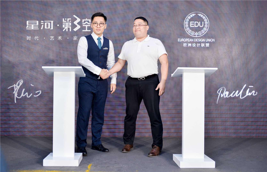 星河第三空間&歐洲設(shè)計聯(lián)盟簽約儀式(星河第三空間總經(jīng)理杜華龍先生(左)與EDU歐洲設(shè)計聯(lián)盟中國區(qū)總經(jīng)理Paul Lin(林紅偉)先生(右))