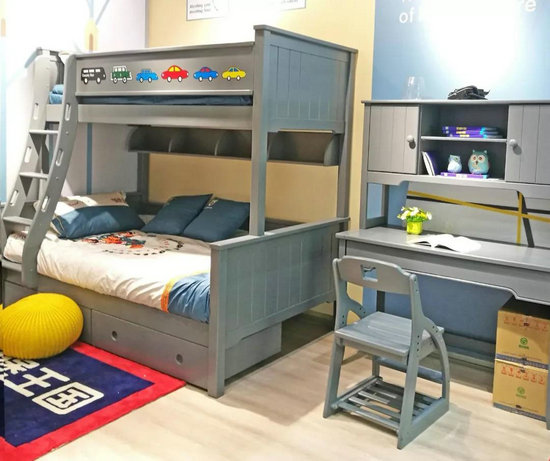 "Elegant bedroom set Bunk bed"同為升級產(chǎn)品,是經(jīng)典的雙層床結(jié)構(gòu),顏色采用流行莫蘭迪色高級灰,足以百搭任意風格的兒童房。護欄迎合孩子對“卡通汽車”的喜愛,親近感十足,護欄可根據(jù)孩子的喜好,自由變換。