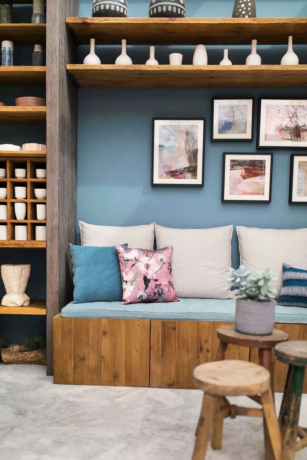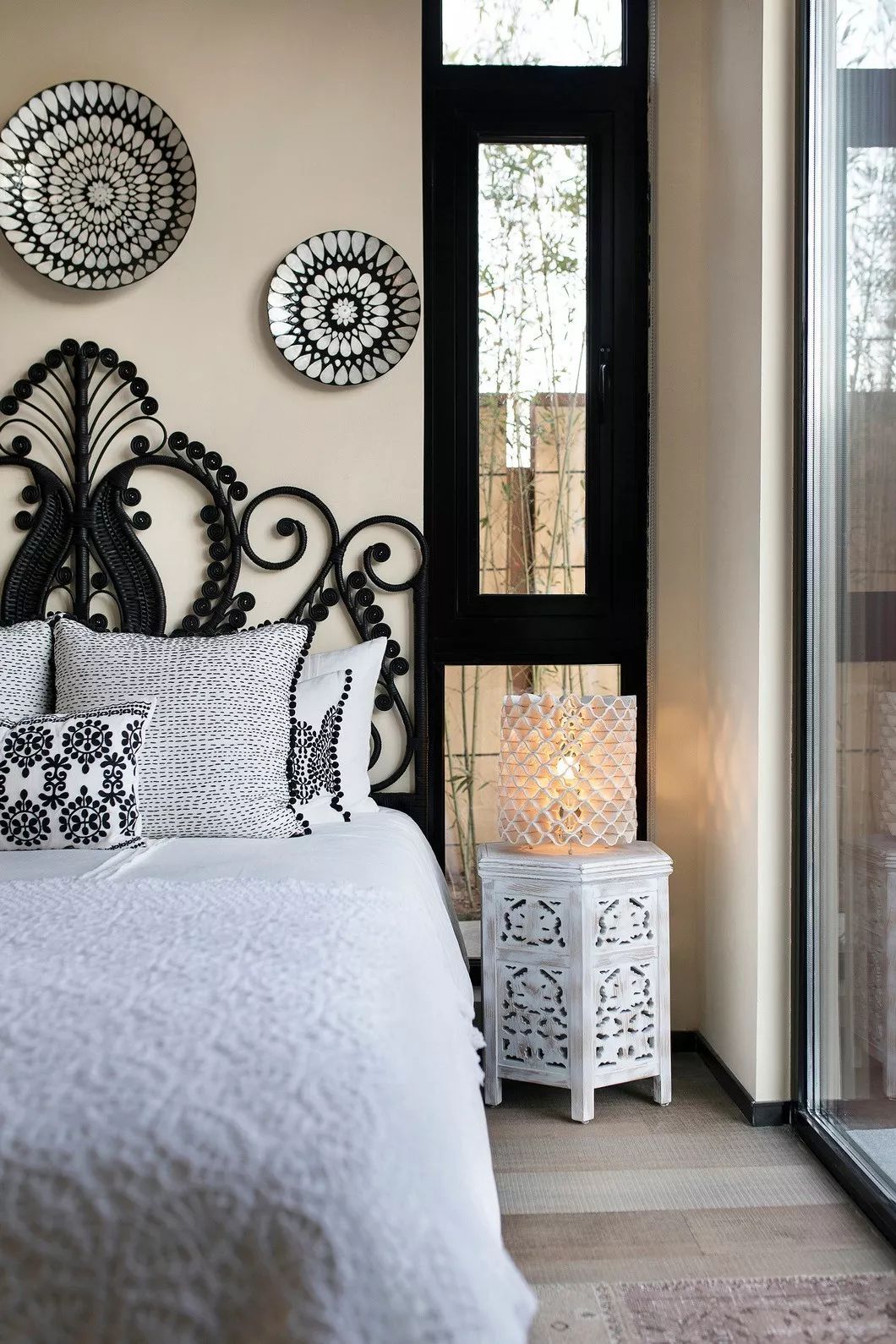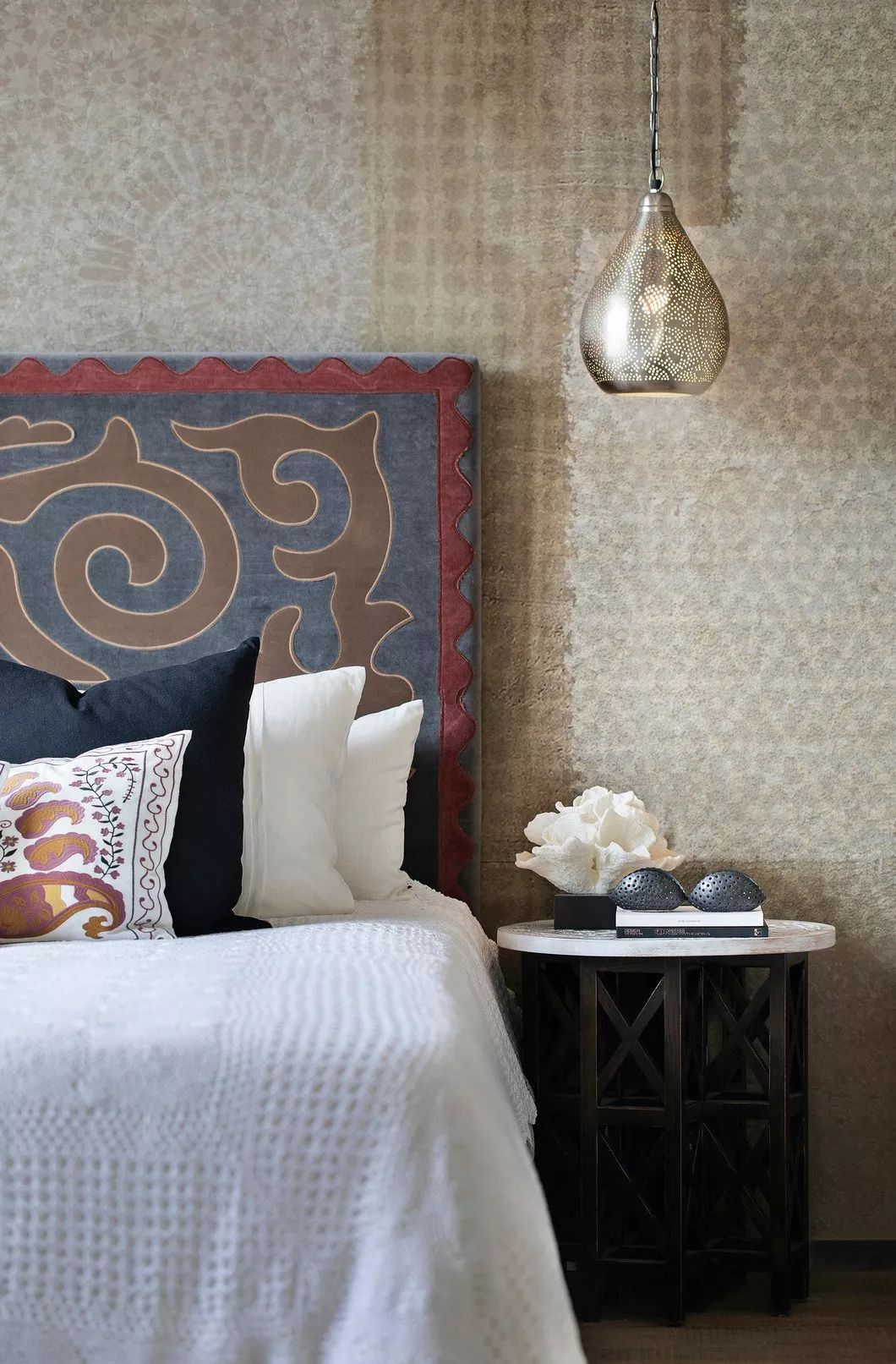 設(shè)計師通過北非設(shè)計元素如毛線編織成的掛畫飾品、紋樣新穎的花樽、民族風(fēng)情印花抱枕等,點染出空間異域夢幻的光彩,同時因浸潤著原木材質(zhì)的清氣,予人安心舒適體驗。