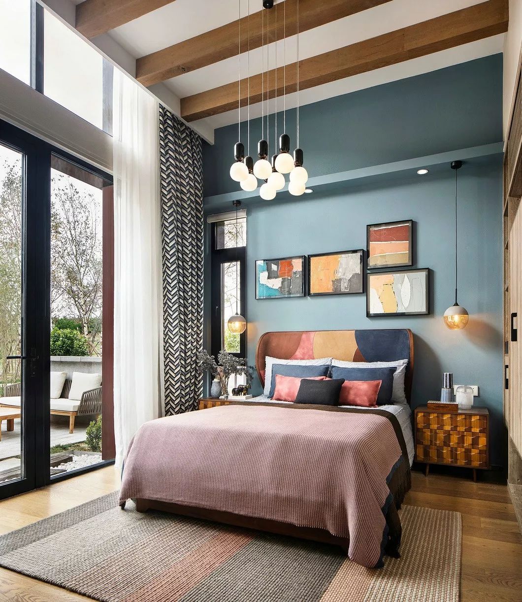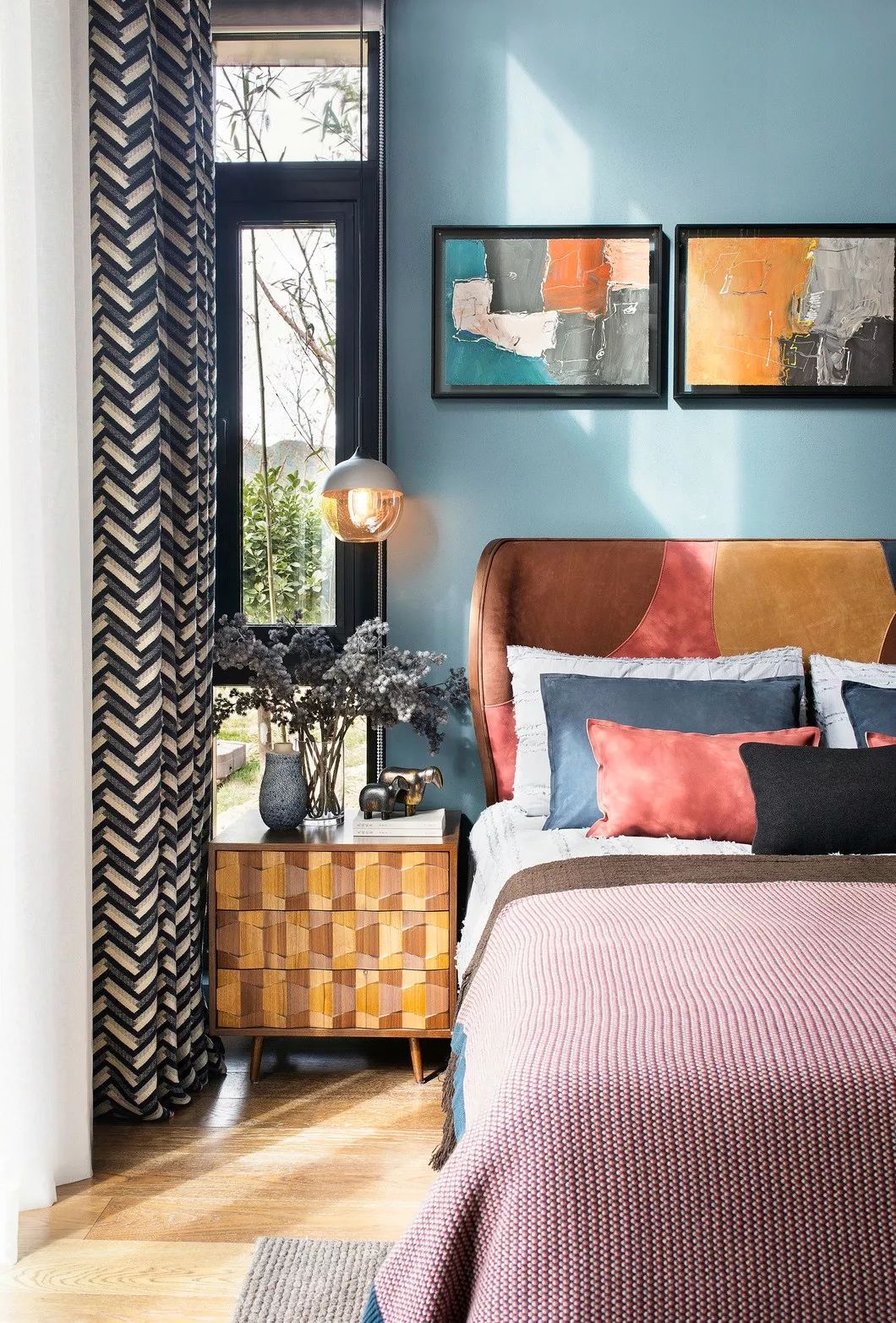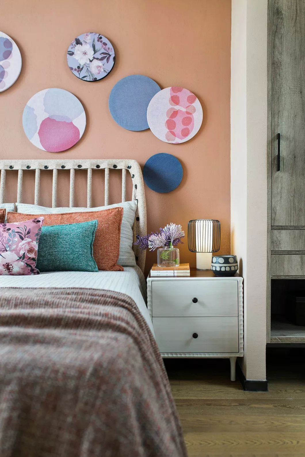 在臥室空間的處理中,布魯盟設(shè)計融入了更多的當(dāng)代筆觸。抽象水粉裝飾畫,通過色彩的調(diào)和來營造空間的夢幻田園氣息。