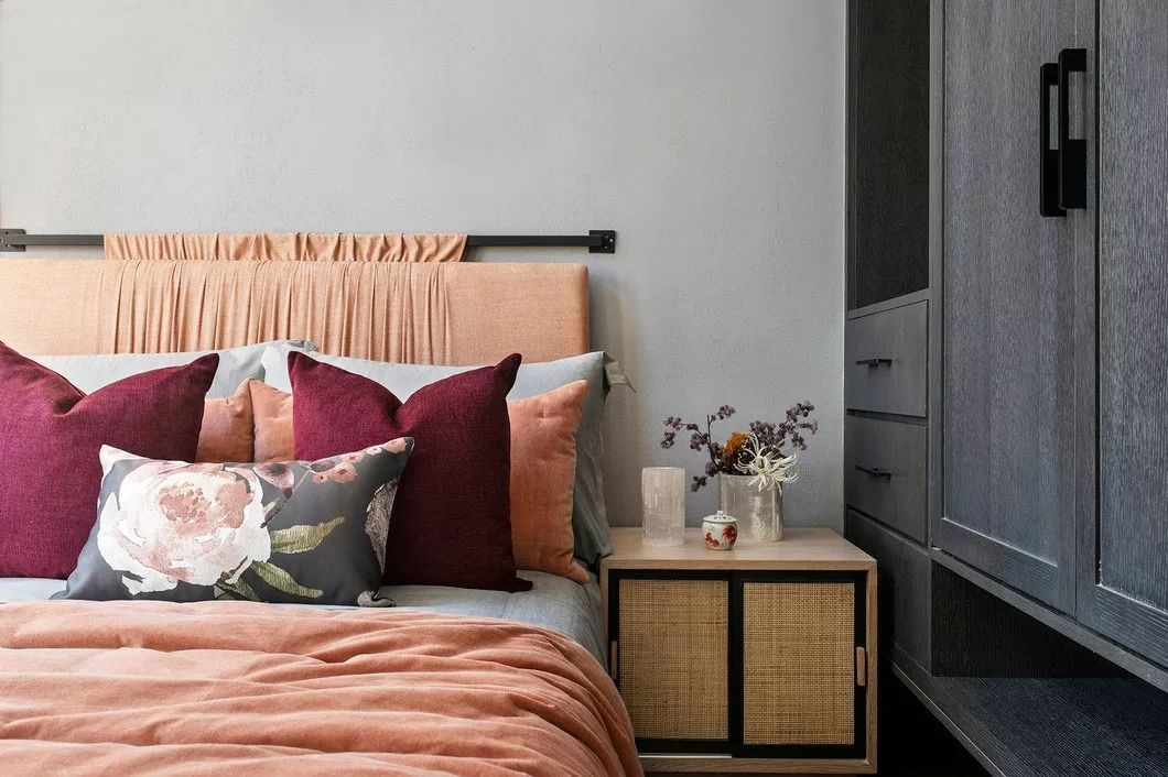 設(shè)計在清涼與溫?zé)帷⒊林c明艷之間尋覓到微妙的平衡,汲取于自然的色彩,亦有著恰到好處的人文溫度。臥室空間設(shè)計融入了簡約的幾何色塊,結(jié)合自然靈韻和極具傳統(tǒng)氣質(zhì)的飾物,使空間氛圍顯得悠然而生動。