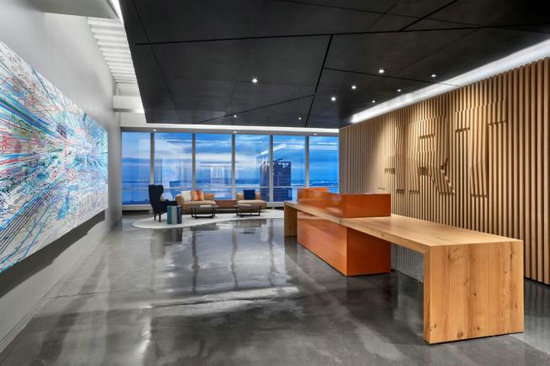 位于美國紐約的Hudson River Trading辦公室設(shè)計項目,其前臺“HRT”背景墻是由美國橡木制成