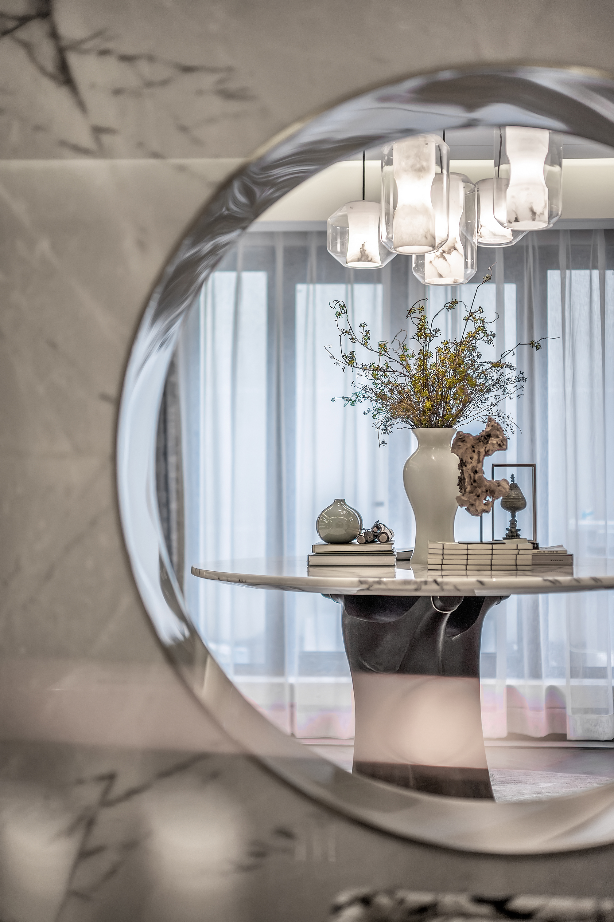 客廳與餐廳的設(shè)計中,《明湖曲》被生動的演繹,設(shè)計師對詩歌進(jìn)行提煉、抽象、變形簡化,將行云流水般的古韻與富有張力的現(xiàn)代浪漫結(jié)合。高貴的氣質(zhì)在高級灰與清雅的綠色結(jié)合的剎那占領(lǐng)整個空間,出于對傳統(tǒng)文化內(nèi)蘊(yùn)的理解和傳承文脈的高遠(yuǎn)信念,邦邦在細(xì)節(jié)的設(shè)計上精筑文人情懷,她將濟(jì)南山水幻化進(jìn)水墨意境的掛畫里,地毯的紋路仿若靈動的明湖,吊燈溫潤的質(zhì)感與盈透的色澤中,閃耀著粼粼波光。