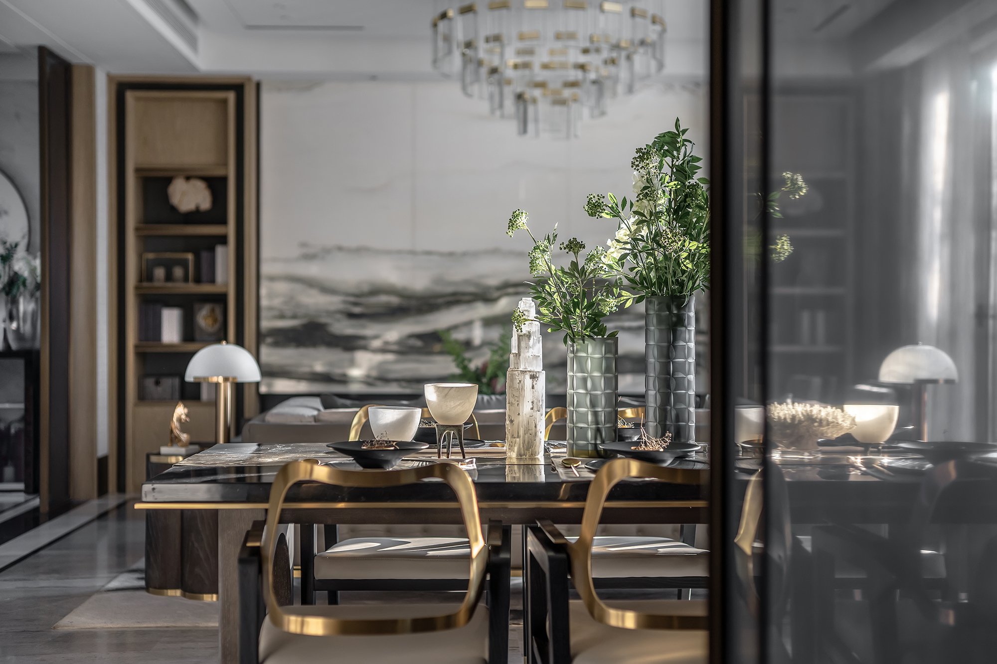 餐廳配合著極簡的設(shè)計構(gòu)思, 色彩上以沉穩(wěn)的黑、華麗的金為主色;看似隨意的一把綠葉,如清風(fēng)徐來;雅白如玉的飾品,演繹出東方文化的清雅韻味。
