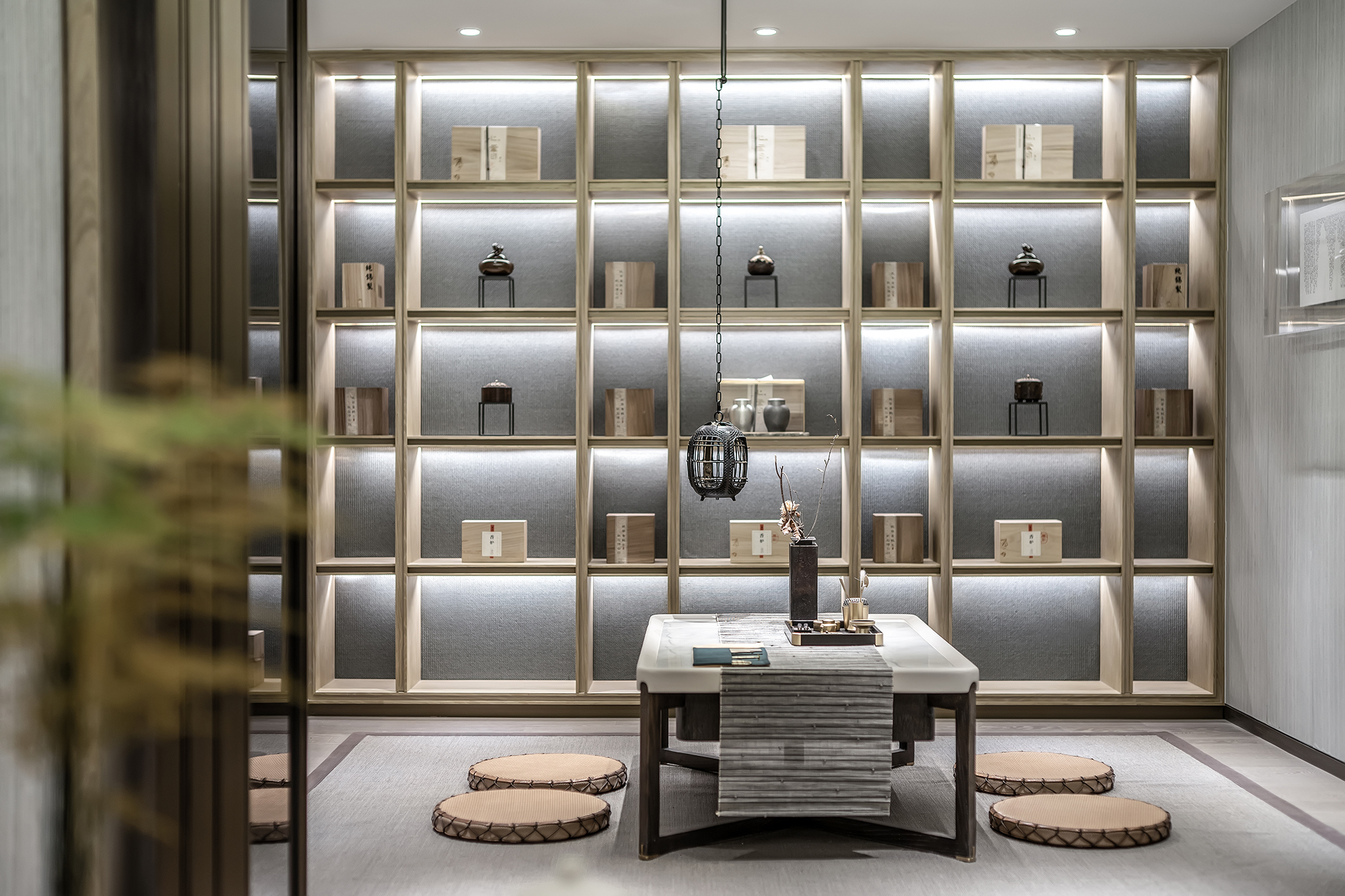 茶室設(shè)計以簡淡為尚,將文仕的風(fēng)雅與現(xiàn)代生活融合,追求和體驗人與自然契合無間的人生境界和精神狀態(tài)。一張古樸的茶桌,以實意虛,一壺清茶,靜守時光,共待流年。