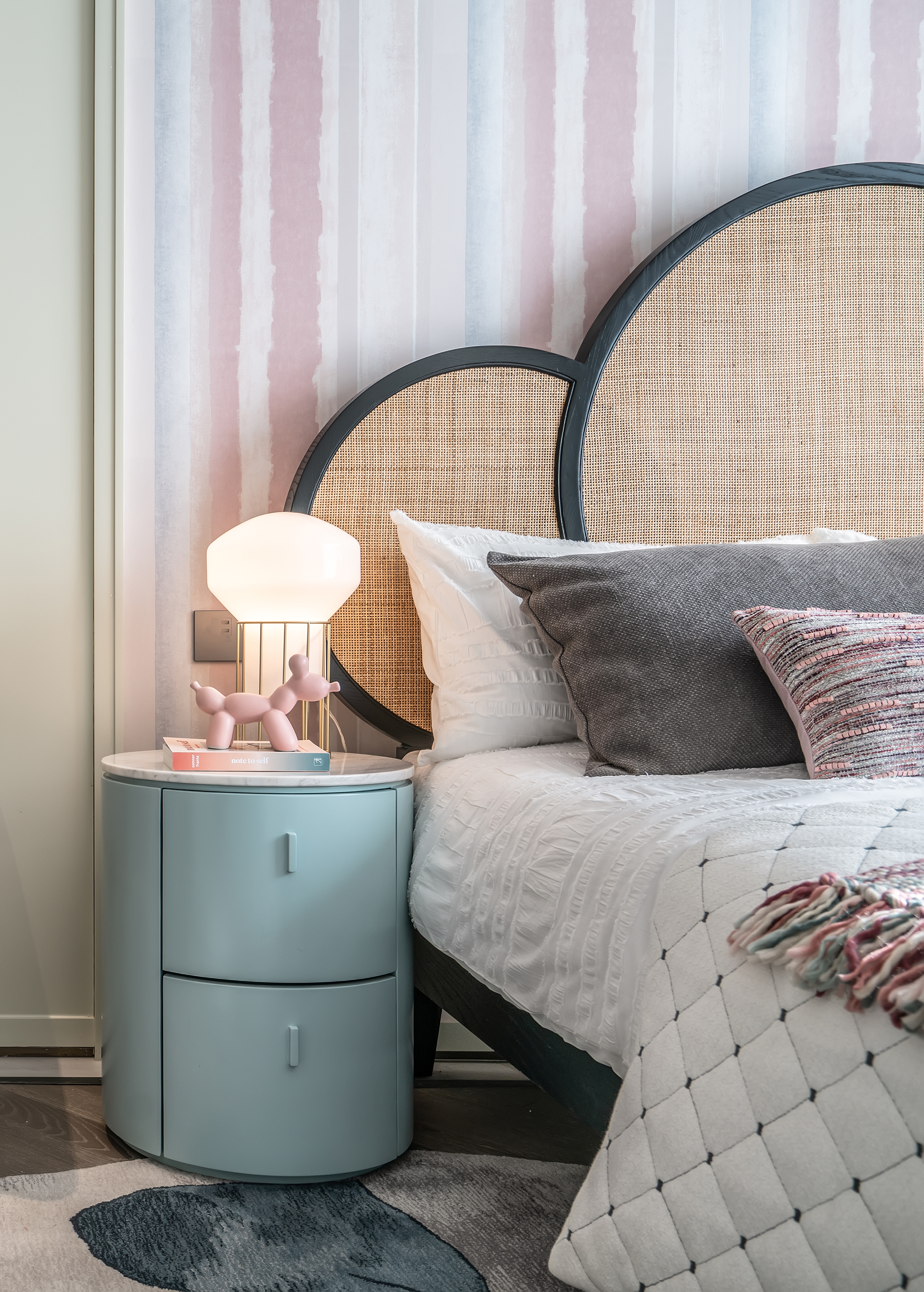 妍麗的紅是空間曼麗的修飾詞采,獨具風(fēng)情的吊燈,讓古典情懷與現(xiàn)代心境交錯。莫蘭迪色的床頭柜和一幅幅別致的裝飾畫在打破之余又平衡了空間界域,為空間帶來別樣的柔情,在現(xiàn)實和夢幻的交界處,一種叫“浪漫”的東西在慢慢升騰。