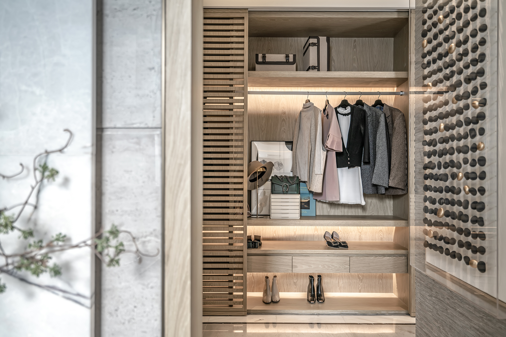 次臥的設(shè)計中,色彩的運(yùn)用冷靜且克制,沉靜的灰調(diào)和趨近自然的木色是空間的主調(diào)。背景墻上將大理石與木格柵并置,于材質(zhì)的碰撞覓得內(nèi)在的均衡,大理石的紋路自然演繹了一幅自然山水之美,賦予空間綿綿不盡的詩意想象。