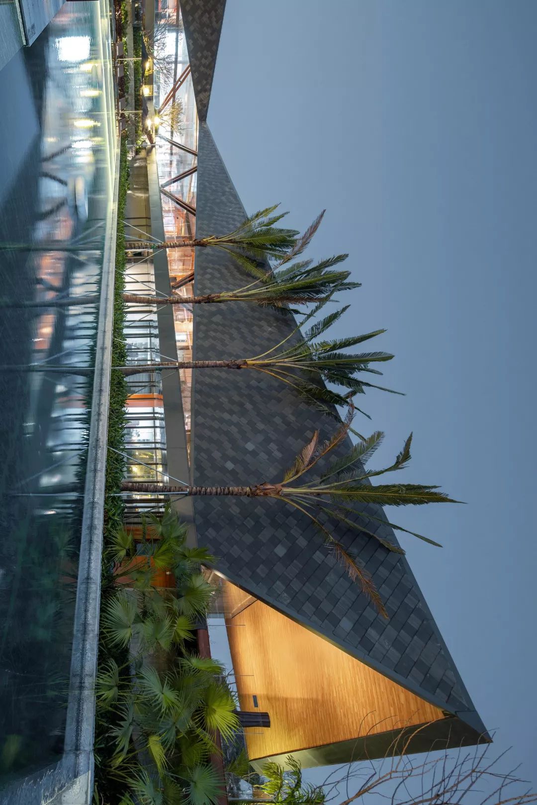 建筑設(shè)計(jì)通透開(kāi)放,自由的屋頂結(jié)合靈活的異形結(jié)構(gòu),同生機(jī)勃勃的自然環(huán)境相融共生。室內(nèi)延續(xù)建筑所賦予的意義,以其為載體,在室內(nèi)空間延展、重組,詮釋其所構(gòu)成的涵義。