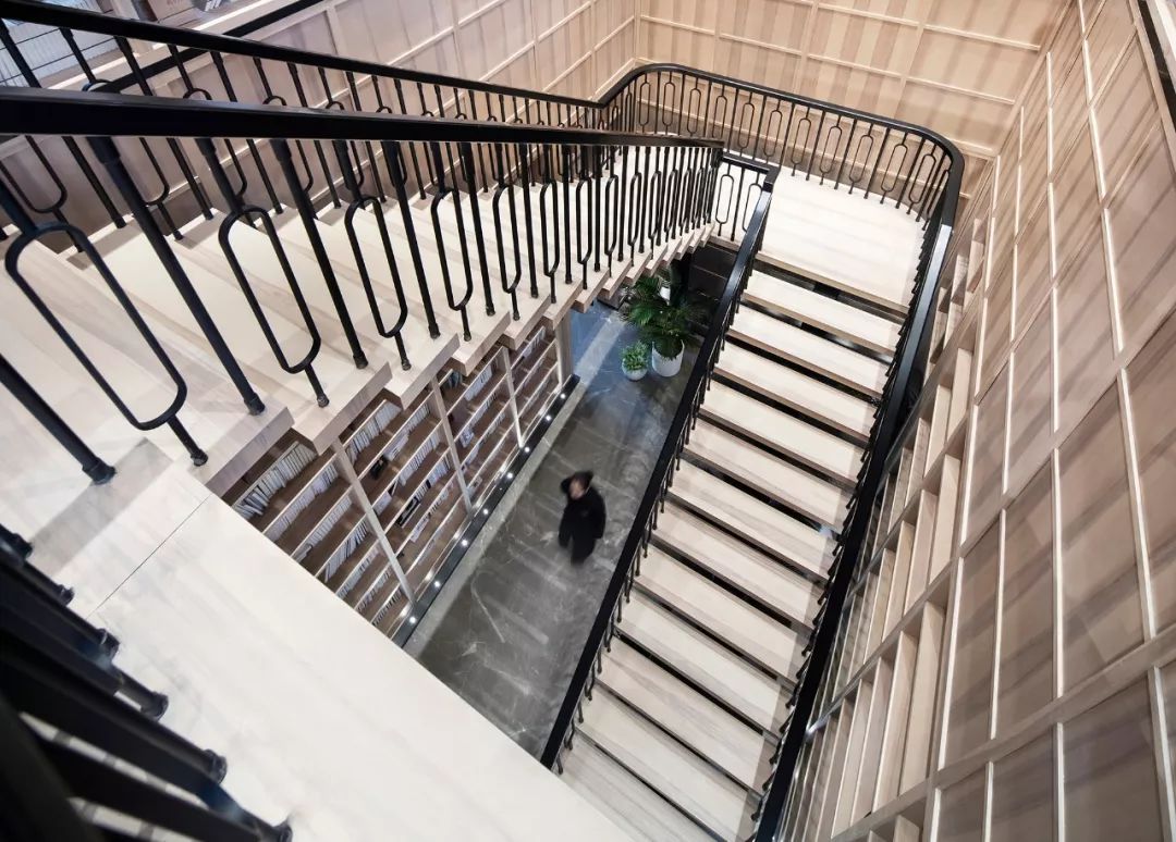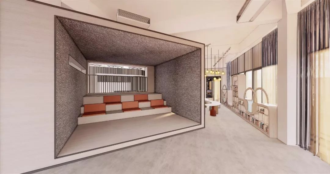 階梯小劇場(chǎng)以盒子的形意巧妙內(nèi)置,區(qū)隔安靜沉謐的書塔區(qū),劃分出一個(gè)吸引人們注意力、讓人全情沉浸的投影空間,此間柔軟的抱枕小物提供最大限度的舒適感,平日里是親子互動(dòng)寓教于樂(lè)、共同學(xué)習(xí)的好去處,亦承載著發(fā)布會(huì)或其它社交活動(dòng)的功能定位。