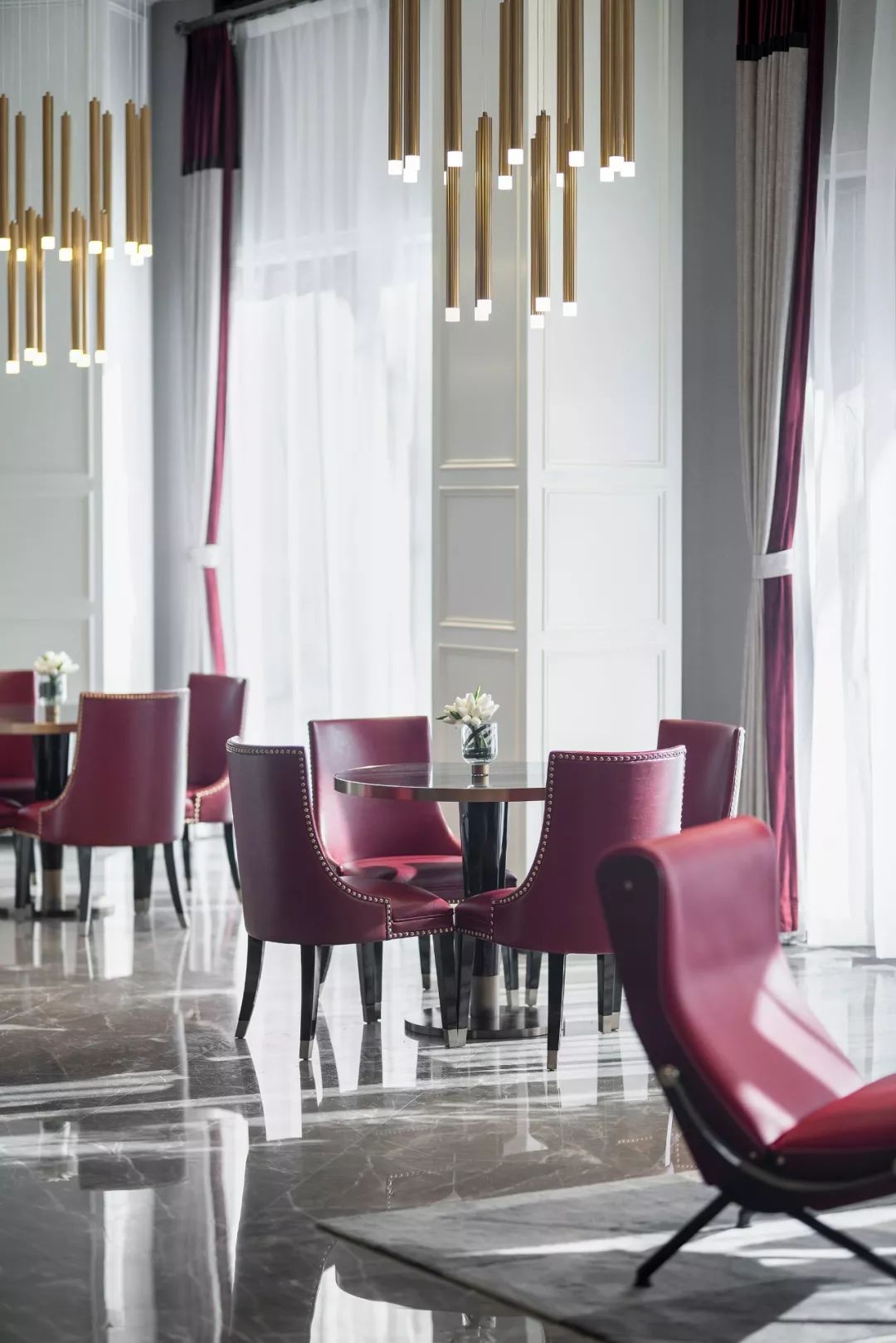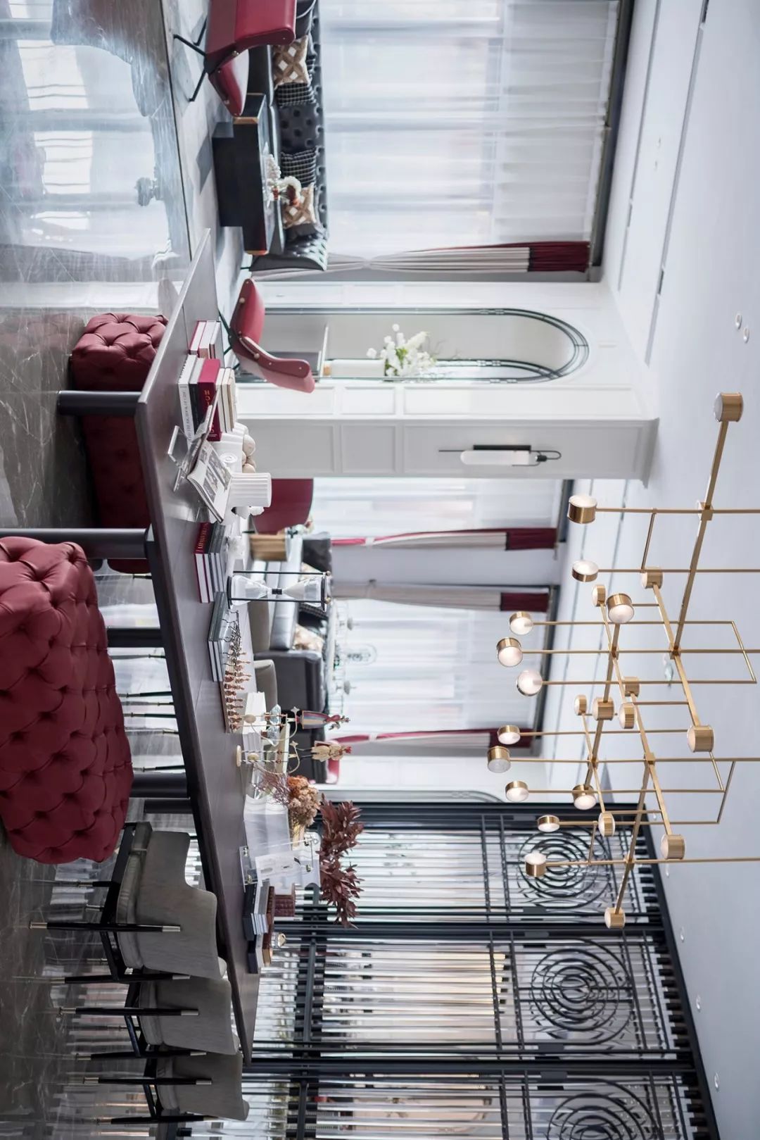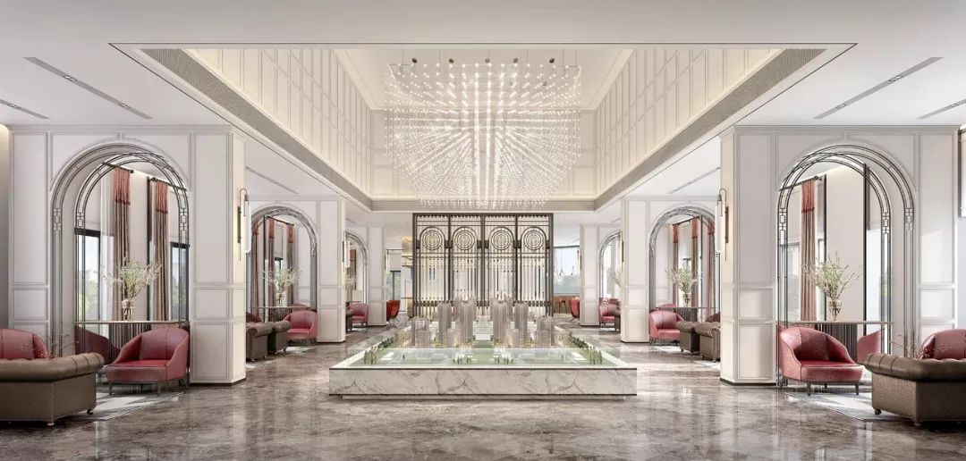 軟裝設(shè)計(jì)中,大廳呈對(duì)稱構(gòu)圖,璀璨耀眼的立體矩塊燈陣,星星點(diǎn)點(diǎn)的細(xì)節(jié)拼湊出米字的大致輪廓,又似不經(jīng)意間抒寫著英倫格紋的疏密意象,層疊有致,意態(tài)萬(wàn)千;洽談區(qū),在歐式花線圓拱形制的隔斷基礎(chǔ)上,黑色鐵藝架、紅色單椅、黑色長(zhǎng)沙發(fā)圍合金色茶幾構(gòu)就一個(gè)舒適放松的商務(wù)對(duì)談空間;飄香玉蘭、復(fù)古時(shí)鐘、噴泉雕塑無(wú)一不彰顯著精致細(xì)節(jié),光影綽約間,英式情調(diào)漫延。