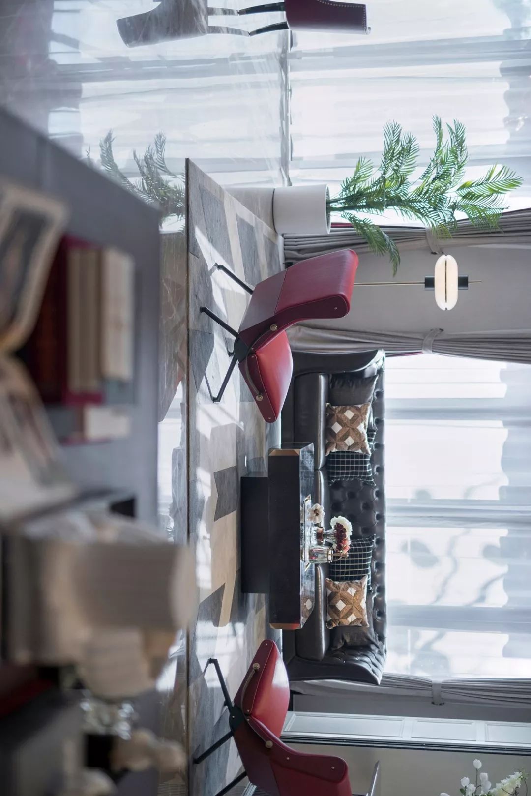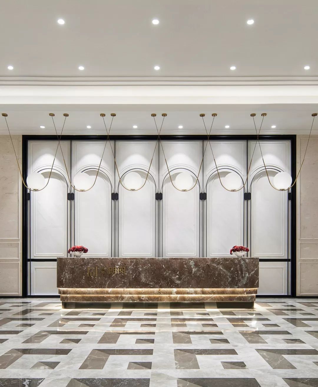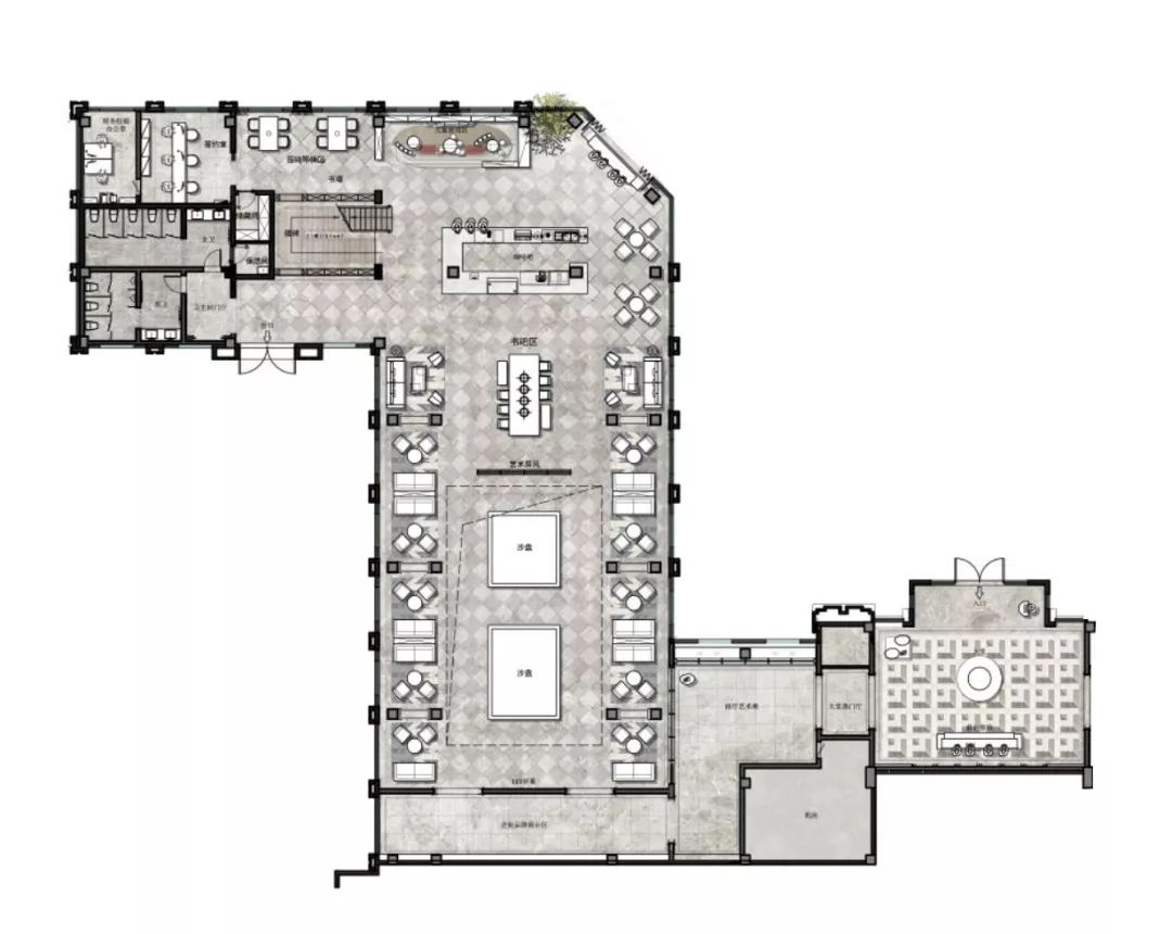 軟裝設(shè)計(jì)中,大廳呈對(duì)稱構(gòu)圖,璀璨耀眼的立體矩塊燈陣,星星點(diǎn)點(diǎn)的細(xì)節(jié)拼湊出米字的大致輪廓,又似不經(jīng)意間抒寫著英倫格紋的疏密意象,層疊有致,意態(tài)萬(wàn)千;洽談區(qū),在歐式花線圓拱形制的隔斷基礎(chǔ)上,黑色鐵藝架、紅色單椅、黑色長(zhǎng)沙發(fā)圍合金色茶幾構(gòu)就一個(gè)舒適放松的商務(wù)對(duì)談空間;飄香玉蘭、復(fù)古時(shí)鐘、噴泉雕塑無(wú)一不彰顯著精致細(xì)節(jié),光影綽約間,英式情調(diào)漫延。