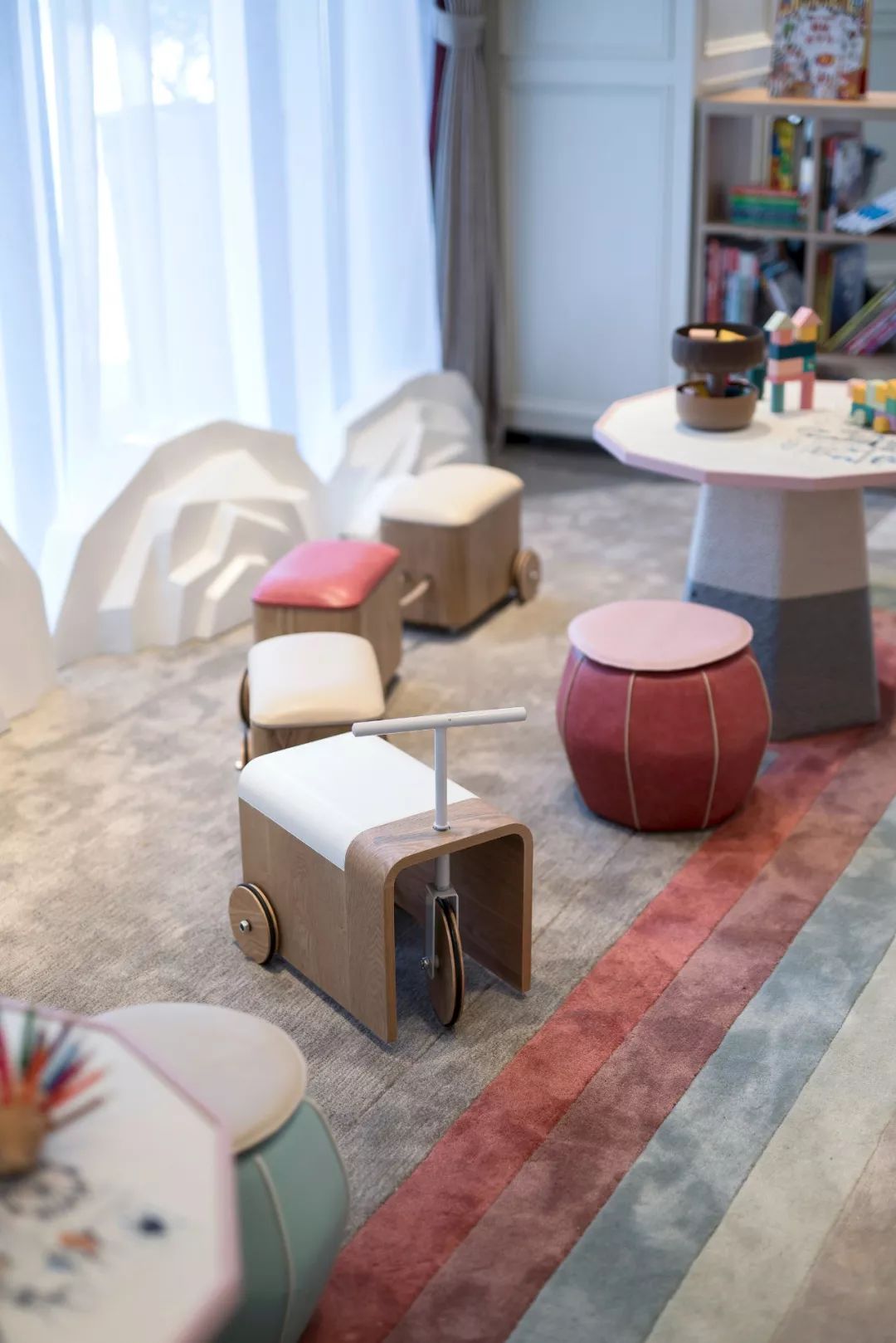 兒童活動(dòng)區(qū)的稚樸生趣自成一派,白色山石樹景、花蕊形吊燈、可愛貓形裝置、滑梯流線的書柜、形似跑道的地毯、自由穿梭的小火車椅子......描繪出一個(gè)活潑生動(dòng)的童夢(mèng)童趣空間。