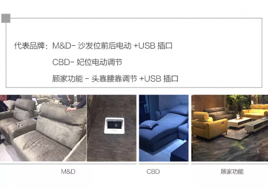當(dāng)然,智能家居不僅在寢具領(lǐng)域,沙發(fā)產(chǎn)品也沒(méi)有落下。例如沙發(fā)電動(dòng)功能位的出現(xiàn)更加頻繁,并且變化的范圍更多,除了傳統(tǒng)的腿部抬高功能外,開(kāi)始出現(xiàn)座位前后調(diào)節(jié)、上下調(diào)節(jié)的功能;通過(guò)功能五金以及與遙控裝置的對(duì)接,頭靠與腰靠的調(diào)節(jié)更加多元及便利;USB等智能接口全面普及等等。