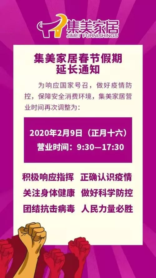2020年1月29日,集美家居發(fā)布《關(guān)于節(jié)后統(tǒng)一延遲營(yíng)業(yè)時(shí)間的決定》,集美家居賣場(chǎng)節(jié)后營(yíng)業(yè)時(shí)間統(tǒng)一調(diào)整為2020年2月9日(正月十六);