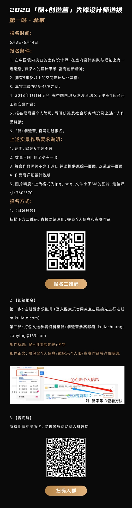 6月23日當(dāng)天,將由陳暄率先發(fā)布2020「酷+創(chuàng)造營」首輪設(shè)計(jì)命題,面向全國范圍征集命題設(shè)計(jì)效果圖,無論你身在何處,無論你是設(shè)計(jì)小白或已頗有成就,只要有想法有能力,即可在酷家樂平臺(tái)進(jìn)行命題設(shè)計(jì)投稿。組委會(huì)將在所有命題設(shè)計(jì)投稿中進(jìn)行篩選,并最終選出5個(gè)作品交由導(dǎo)師親自點(diǎn)評(píng),并將在媒體平臺(tái)對(duì)優(yōu)秀作品及設(shè)計(jì)師多重曝光展示。