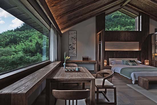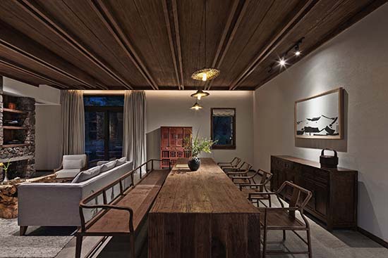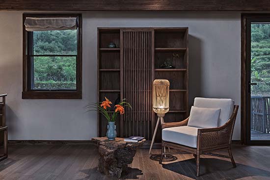 周赫:旗山俠隱的地理位置是在浙江遂昌,山林盡處的古村落里,遂昌本來就是一個(gè)有著1800年歷史的美麗山城。被譽(yù)為“東方莎士比亞”的戲劇大師湯顯祖在此主政5年,創(chuàng)作了不朽名著《牡丹亭》。項(xiàng)目所在的地方跟龍泉市交界,“龍泉寶劍”“龍泉青瓷”都是屬于國家非物質(zhì)文化遺產(chǎn)。項(xiàng)目所在的村子向來都有習(xí)武的傳統(tǒng),并且保留至今??梢哉f,這里是一個(gè)人文薈萃之地。我們是在建設(shè)之初就進(jìn)駐到項(xiàng)目里,深度的考察了當(dāng)?shù)氐母鞣N人文和歷史傳統(tǒng),讓它們適宜的出現(xiàn)在我們的設(shè)計(jì)里,讓來這里入住的人們能夠切身的體驗(yàn)感受到歷史文化的浸潤。在家具和陳設(shè)上大量使用了老榆木,并使用當(dāng)?shù)貍鹘y(tǒng)的匠人技術(shù),純手工打磨,使其具有記憶的紋理。同時(shí)我們也在居民家中回收了一些具有歷史感的老物件,比如榆木小幾,老食盒等。另外,我們選用了當(dāng)?shù)鼐哂刑厣闹袼囈约熬哂?70年歷史的古窯坊青瓷作為客房里的陳設(shè)和一些符號(hào)元素。所有這些,都不是簡單的堆砌,而是深入到歷史中,去思考它們存在的方式和意義。通過最謙卑的方式來呈現(xiàn)其本真,在做到舒適的體驗(yàn)下盡可能保留過去的記憶和紋理。