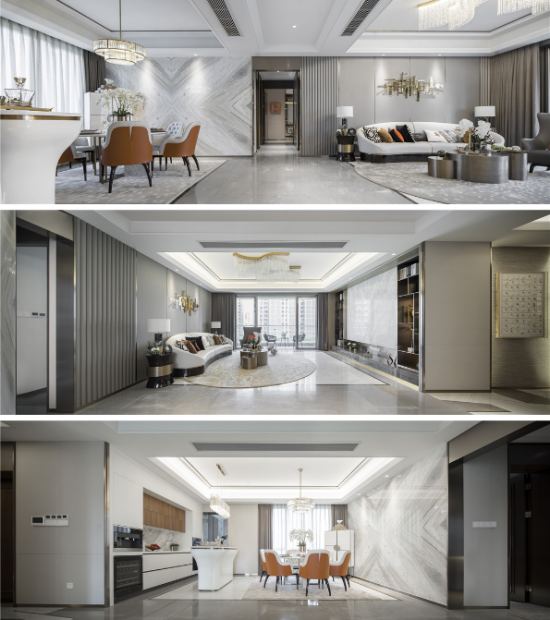 【黃柏元】:該作品因位于上海浦東陸家嘴高級地段,建筑在外觀設(shè)計上就很時尚,全部外墻采用鋁板現(xiàn)代設(shè)計,所以我們在室內(nèi)設(shè)計上也延續(xù)了這一特點,都采用現(xiàn)代、輕奢、時尚的設(shè)計。當(dāng)然因我們作品的定位人群是高端中年族群,所以我們在設(shè)計風(fēng)格上出了時尚輕奢外,也加入了一些現(xiàn)代簡歐元素,讓現(xiàn)代與古典融合,賦予了作品幾分貴族氣息。