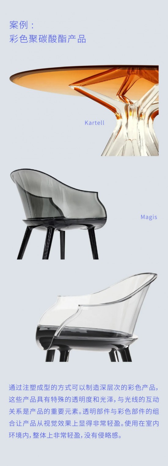 當設計師想像一種產(chǎn)品或塑料半成品具備透明且反光的特性,有點像吹制玻璃時,可以考慮聚碳酸酯材料。不論是模制或是擠制的都有類似效果。聚碳酸酯可以用于制造產(chǎn)品或者室內裝飾,特點是具有很高透明性,色彩豐富還有反光效果,表面堅硬。可以營造一個特點鮮明的居住空間。