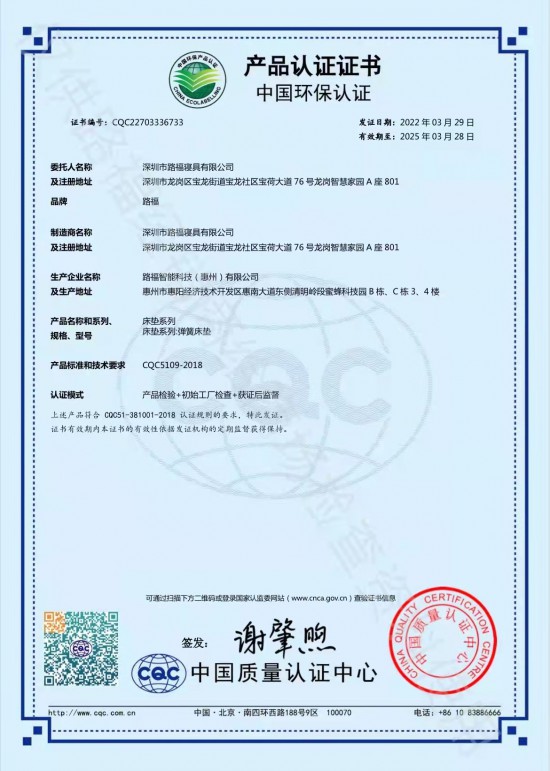 近日,中國質(zhì)量認(rèn)證中心(英文簡稱:CQC)向“深圳市路福寢具有限公司”(以下簡稱:路福)頒發(fā)了智能床墊系列、床墊系列、軟體床系列的中國環(huán)保產(chǎn)品認(rèn)證證書。路福積極響應(yīng)國家環(huán)保產(chǎn)業(yè)政策號召,主動肩起負(fù)企業(yè)社會責(zé)任,啟動了向CQC申報中國環(huán)保產(chǎn)品認(rèn)證工作,歷時壹年時間,經(jīng)過資料編撰、產(chǎn)品檢測、體系運(yùn)行、內(nèi)部檢查、CQC分中心派員核查、問題整改等環(huán)節(jié),最終通過審核獲得證書。