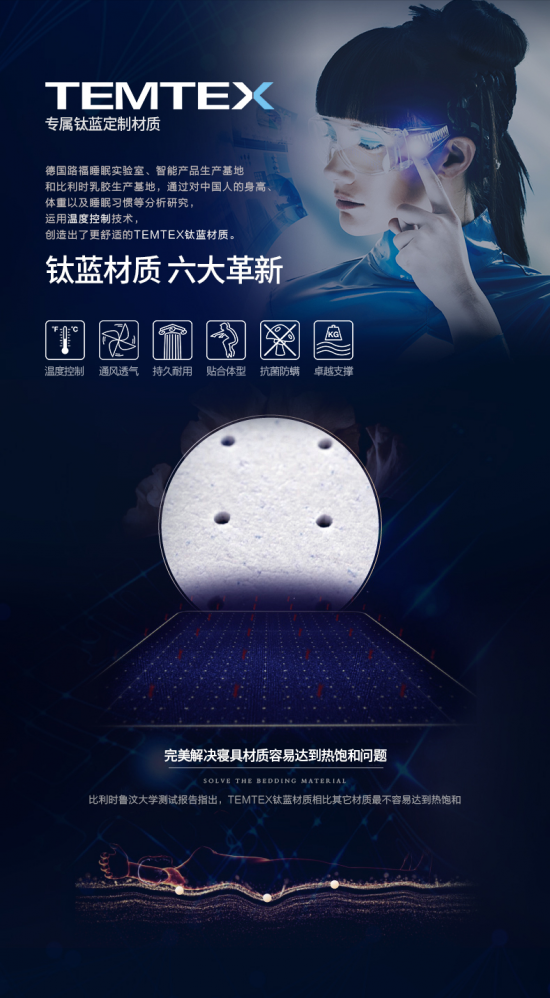TEMTEX鈦藍材質(zhì)是路福德國總部與比利時陸文大學(xué)共同研發(fā)而成的新型材質(zhì),此材質(zhì)是全球唯一能夠解決熱飽和的材質(zhì),也是德國路福特有的材質(zhì),擁有冬暖夏涼的效果,不僅如此,鈦藍材質(zhì)還是一種能完全貼合身體輪廓的開放性感溫細(xì)胞材質(zhì),會根據(jù)人體對床墊表面形成不同壓力自動集結(jié),給予身體額外的支撐。