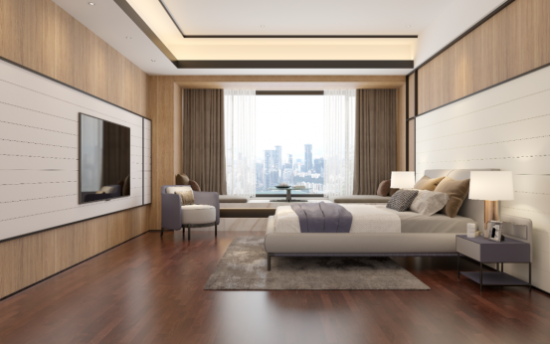 胡桃木色地板典雅大方,賦予睡眠空間寧靜禪意。多處細(xì)節(jié)融合線條元素,相互交映,營造獨(dú)特而統(tǒng)一的空間秩序,帶來至簡而美的生活體驗(yàn)。