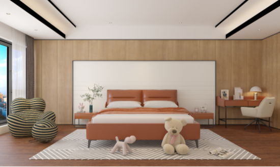 CBD家居·金豹 | J007軟床,暖橙色提亮空間,靠包輔以線條內(nèi)嵌設(shè)計(jì),體塊感更顯飽滿,自然倚靠,達(dá)到舒適與美感的平衡。創(chuàng)意單椅、簡易書桌各立于一角,打造出多元化場景,治愈溫馨。