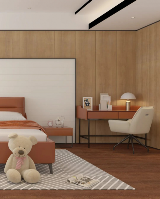 將原木風(fēng)的占比降低,男孩房簡約而兼具輕奢質(zhì)感。