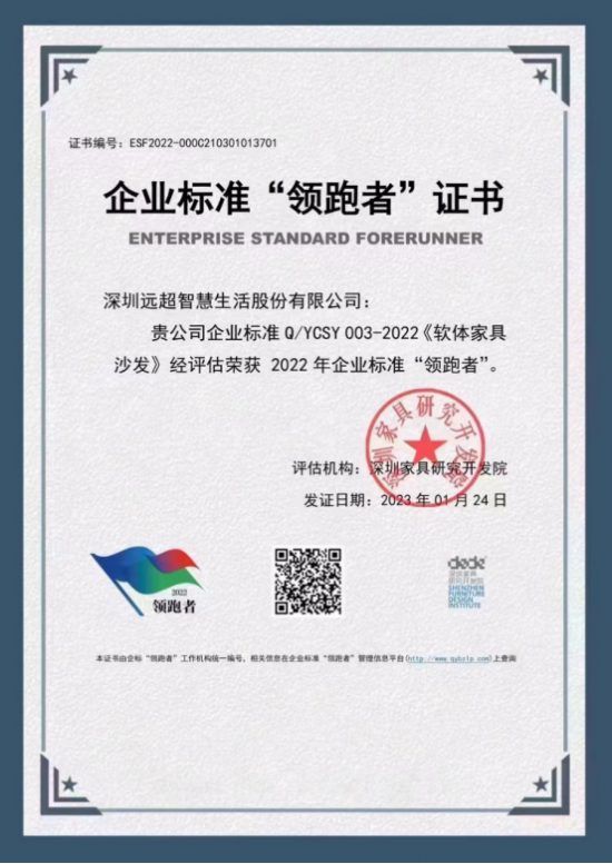 近期,中國標(biāo)準(zhǔn)化研究院企業(yè)標(biāo)準(zhǔn)領(lǐng)跑者管理信息平臺公布2022年企業(yè)標(biāo)準(zhǔn)“領(lǐng)跑者”名單,深圳遠(yuǎn)超智慧生活股份有限公司(即CBD家居)憑借企業(yè)標(biāo)準(zhǔn)Q/YCSY 003-2022《軟體家具 沙發(fā)》榮獲企業(yè)標(biāo)準(zhǔn)“領(lǐng)跑者”證書,展現(xiàn)了CBD家居的企業(yè)高標(biāo)準(zhǔn)技術(shù)實力。