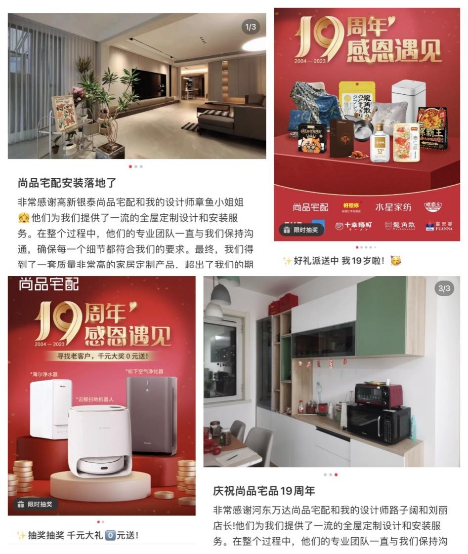 在社交媒體平臺,尚品宅配在6月18日當(dāng)天攜手中國聯(lián)通、創(chuàng)米小白、燕之屋等19個品牌,共同發(fā)起周年慶跨界互動與粉絲營銷,打造多張品牌聯(lián)合慶生海報,通過轉(zhuǎn)發(fā)抽獎、熱搜話題等,將品牌熱度推向新高。截止目前,#尚品宅配19有愛、#19周年我和尚品宅配的故事等話題閱讀量累計超千萬,超千位用戶參與分享或發(fā)布周年慶相關(guān)內(nèi)容。小紅書也發(fā)起#19周年我和尚品宅配的故事#征集活動,抽獎送千元大禮。