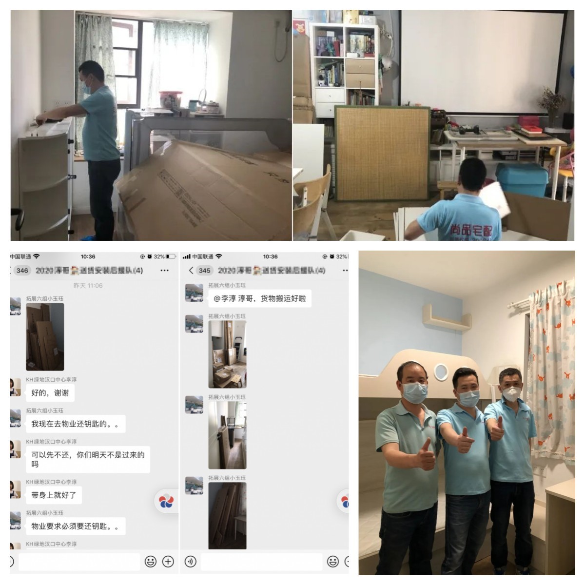 陳經(jīng)理在與物業(yè)溝通后,提前做好準(zhǔn)備,反復(fù)與師傅確定具體上門時(shí)間以及安裝人數(shù)。由于客戶在老家沒回到武漢,陳經(jīng)理建立起“客戶家送貨安裝后援隊(duì)”的微信群,設(shè)計(jì)師上門幫客戶收貨,在群里播報(bào)送貨進(jìn)度,師傅送完后讓設(shè)計(jì)師把收貨清單發(fā)在群里讓客戶確認(rèn),實(shí)時(shí)為客戶播報(bào)現(xiàn)場(chǎng)情況使其放心。