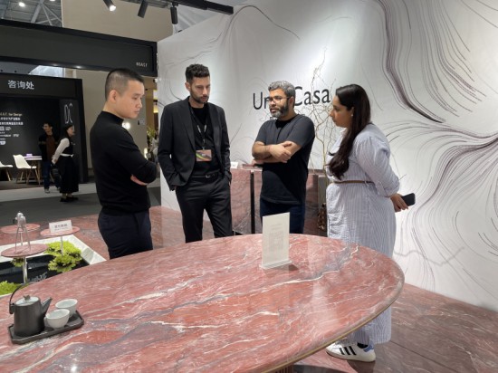 在其展位上,一張淺白色大理石餐桌紋理細(xì)膩,透出溫潤光澤。遠(yuǎn)看,“桌腿”藏在輕盈的天鵝絨簾中,石板就像飄浮在空中。