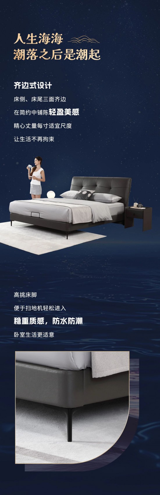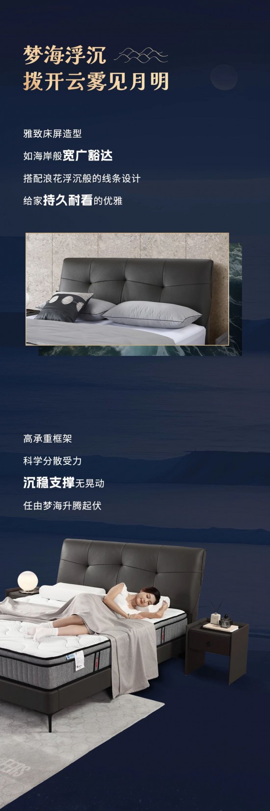 核心提示:夢海浮沉,撥開云霧見月明,雅致床屏造型,如海岸般寬廣豁達(dá),搭配浪花浮沉般的線條設(shè)計(jì),給家持久耐看的優(yōu)雅。