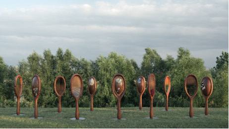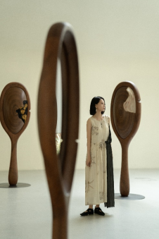 她設(shè)計(jì)了十二枚鏡面,構(gòu)成一個(gè)橢圓形裝置,象征生命的循環(huán)往復(fù)與時(shí)間的永恒流動(dòng)。每一枚鏡子背后展示了對(duì)應(yīng)月份的花卉,象征自然界的變化與生命的節(jié)奏。鏡面采用了特別定制的幽靈鏡效果,具有漸變的反射能力;使觀眾在鏡前不僅能看到自己的倒影,還能模糊地感知到背景中的年輪圖案。這種交互效果使得觀眾的身影與自然的紋理相融合,增強(qiáng)了人與自然的連接感。觀眾可以在鏡面之間隨意走動(dòng),觀察不同鏡面的花卉與自己的倒影,與時(shí)間對(duì)話,回顧過去、審視現(xiàn)在并展望未來。