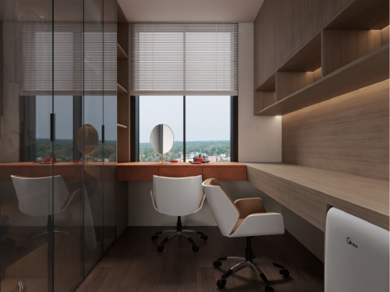 復(fù)古風(fēng)一貫到底,以L型懸空臺連接全屋功能區(qū),可學(xué)習(xí)、可辦公,亦可梳妝打扮;洞察生活所需,上層格柜有序收納,一側(cè)玻璃門精致高級,美而實用。