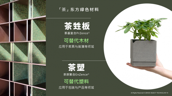 普通的茶渣,在經(jīng)過收集、篩選、清洗、消毒、干燥、粉碎等環(huán)節(jié)后,變身成為茶基復(fù)合“茶甡板”和茶原聚合“茶塑”,前者可代替木材應(yīng)用于家具與裝潢等領(lǐng)域,后者可代替塑料應(yīng)用于包裝與產(chǎn)品等領(lǐng)域,且實(shí)現(xiàn)100%降解,包括海洋降解、淡水降解、土壤降解,為可持續(xù)發(fā)展提供一種新的方案,實(shí)踐「生生不息,永續(xù)未來」。