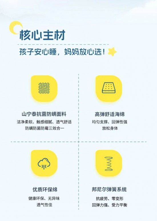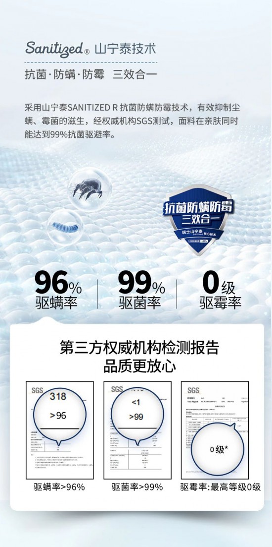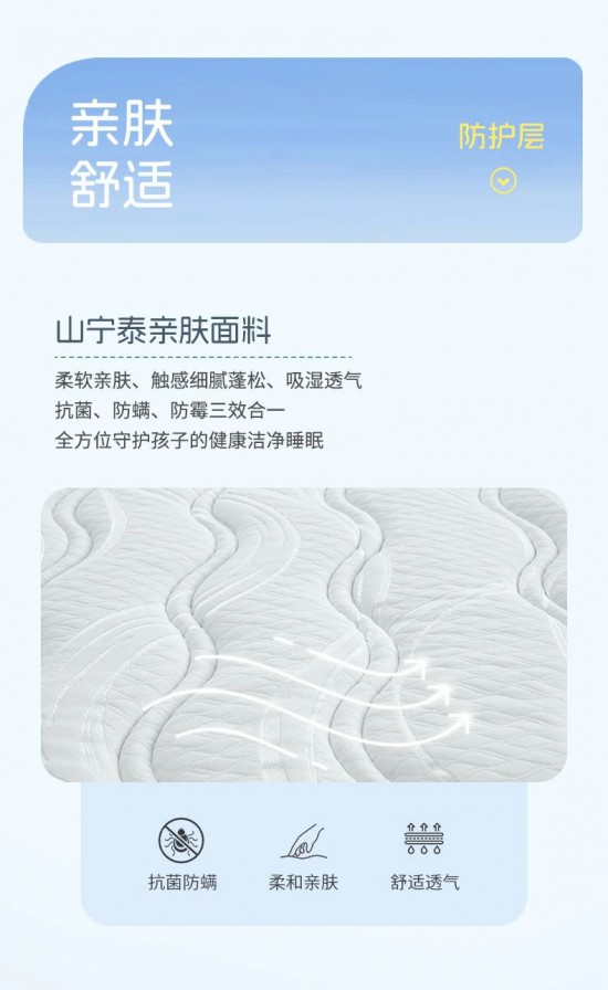 核心提示:山寧泰親膚面料,柔軟親膚、觸感細膩蓬松、吸濕透氣,抗菌、防螨、防霉三效合一全,方位守護孩子的健康潔凈睡眠。